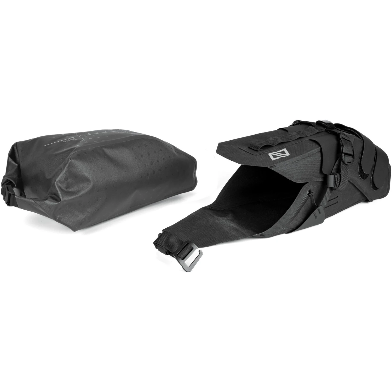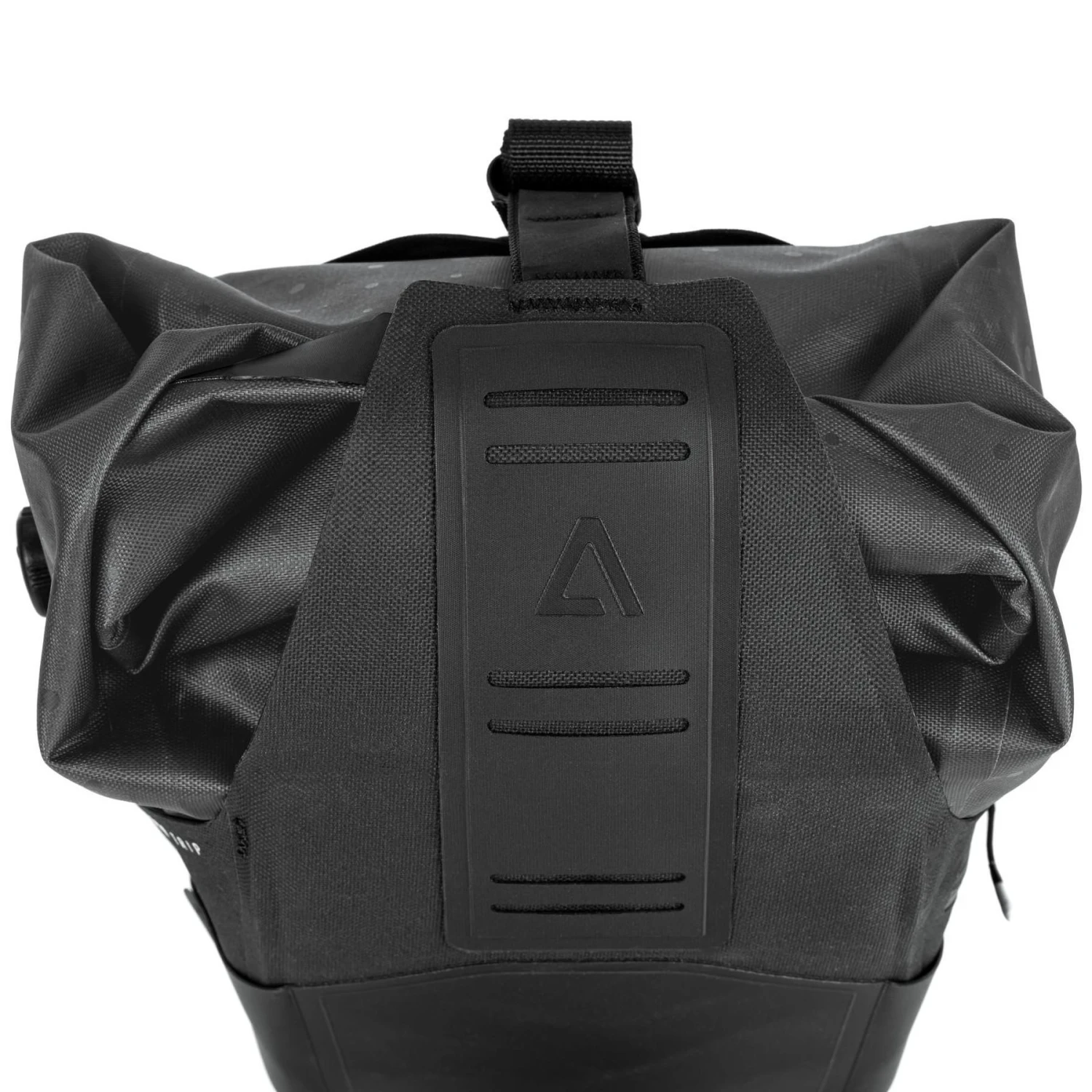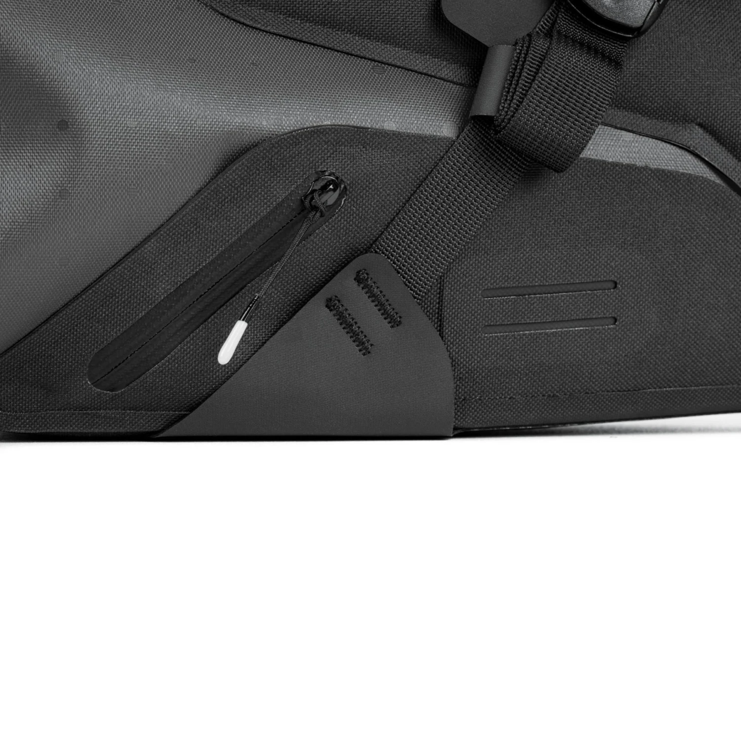De Cube Acid Pack Pro zadeltas is ontwikkeld in samenwerking met ervaren bike packers. Het tweedelige systeem, bestaande uit harnas en waterdichte, gelaste droogzak, is functioneel ontworpen en dankzij de flexibele MOLLE-constructie kan het harnas tegelijkertijd aan de rail en zadelpen worden bevestigd. De robuuste droogzak wordt in het harnas gestoken, vastgezet en ’s avonds of tussendoor snel verwijderd. Om de inhoud van de zak gemakkelijker samen te persen, is een handmatig ontluchtingsventiel aangebracht, waardoor de lucht kan ontsnappen. Reflecterende elementen verhogen de zichtbaarheid in het verkeer en ook een achterlicht kan gemakkelijk worden geïntegreerd.