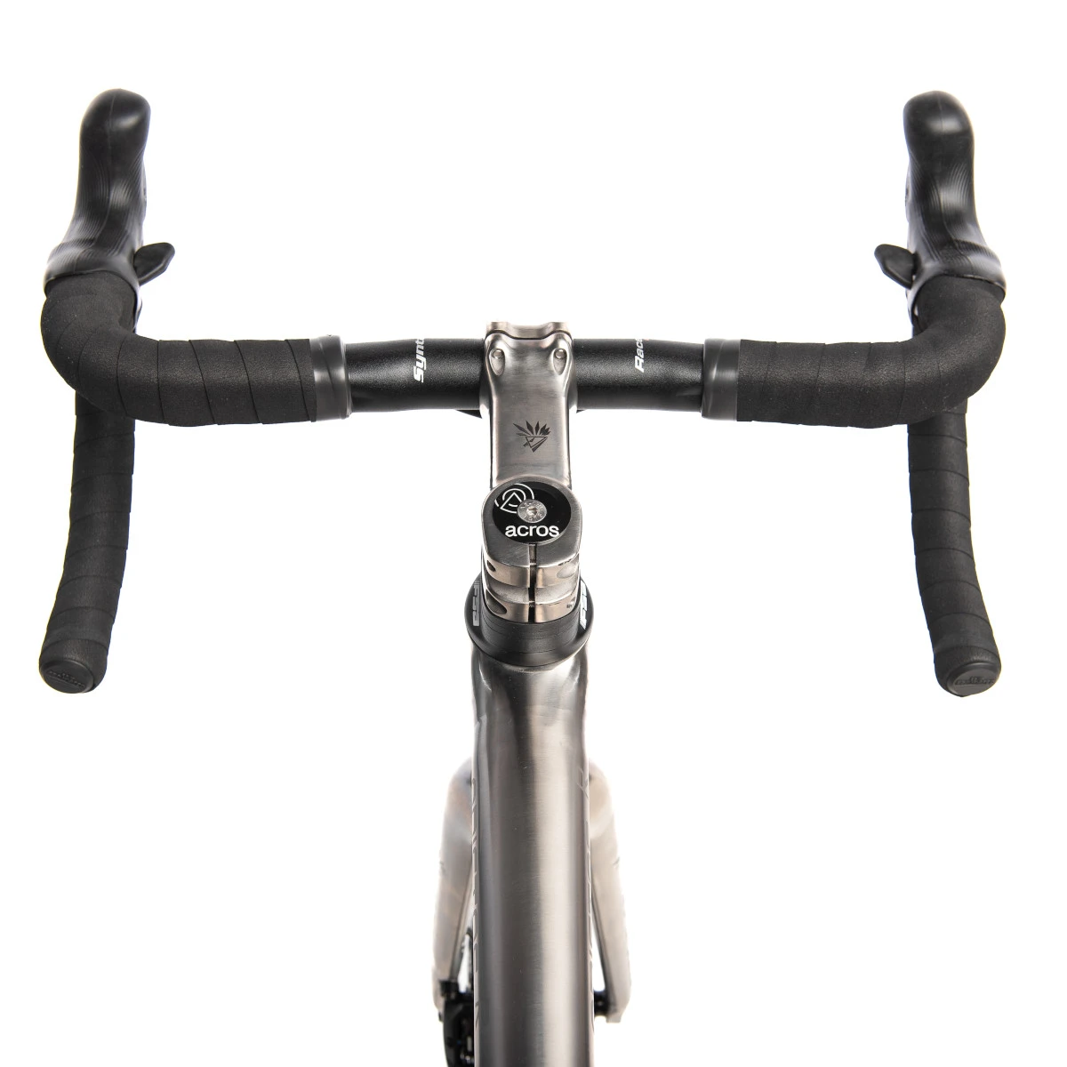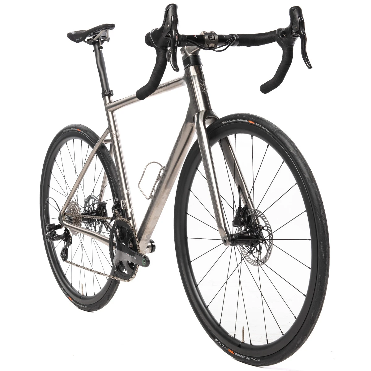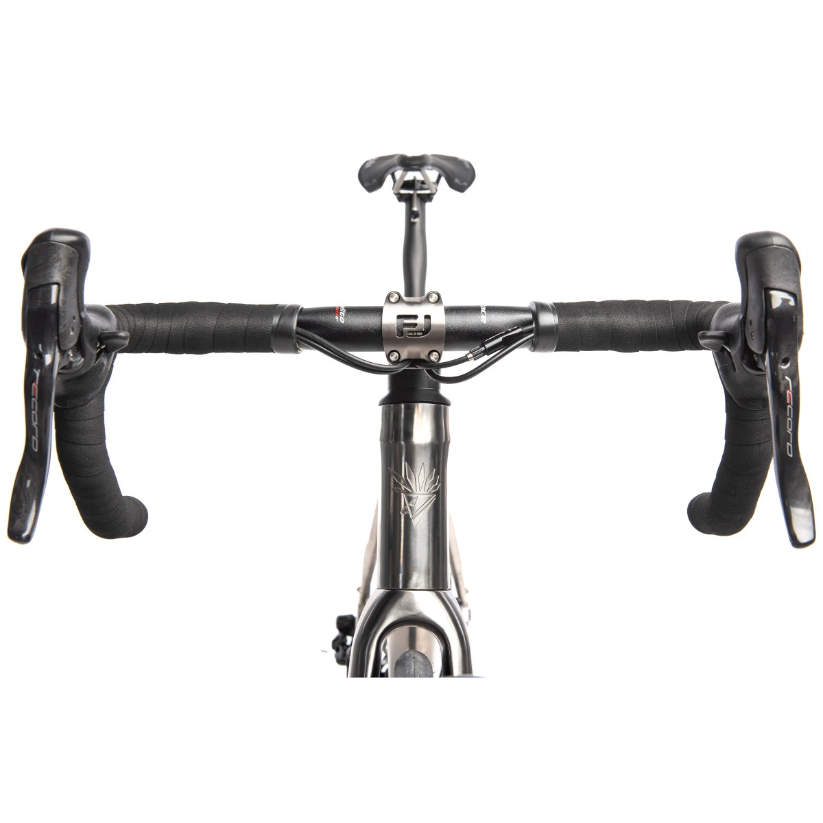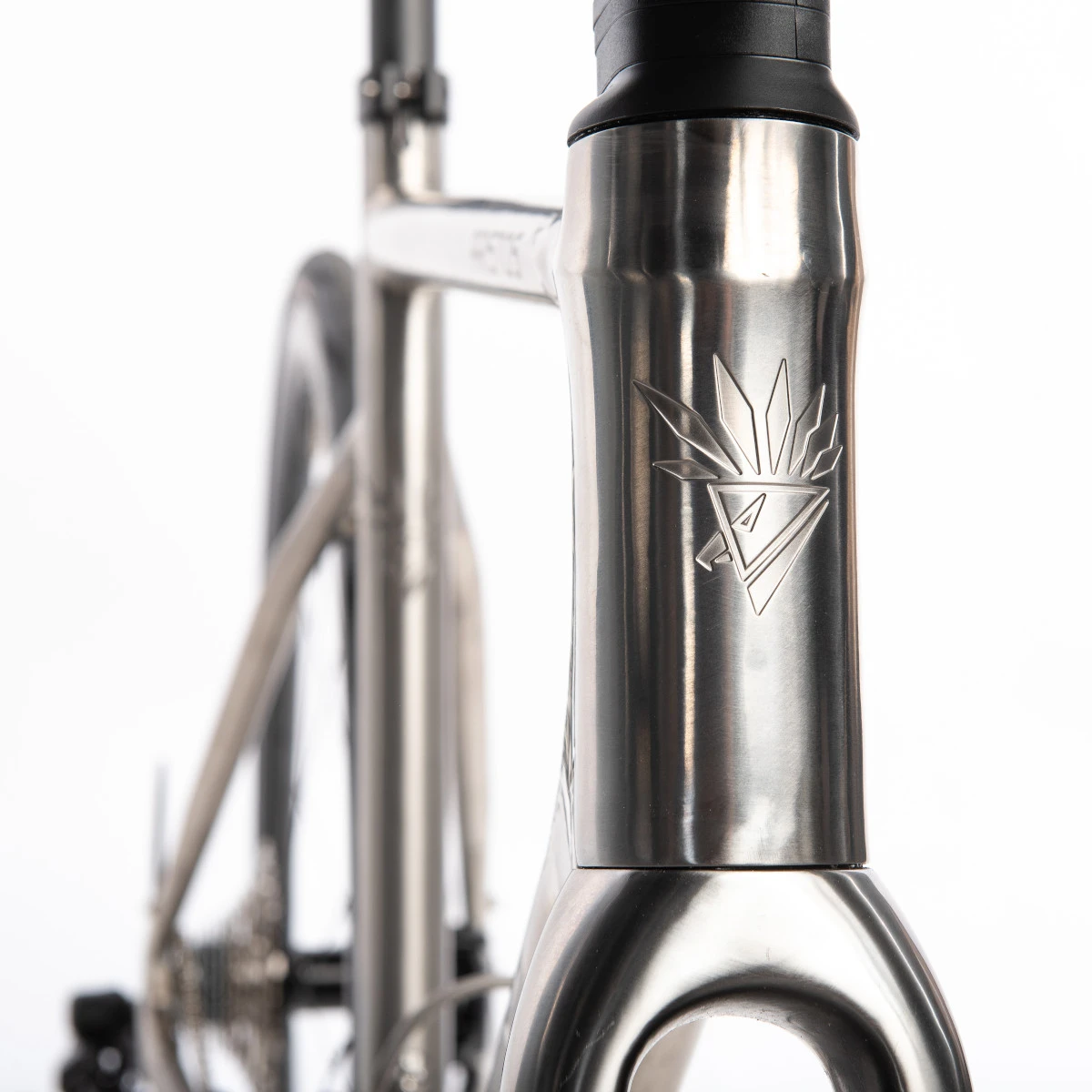 Falkenjagd herinterpreteert titanium met de Aristos R Speedgravel. Vakkundig vakmanschap ontmoet innovatieve productieprocessen. De Aristos R maakt indruk met zijn vloeiende ontwerptaal en onovertroffen integratie van kabels en extra onderdelen. Het frame profiteert van de duurzaamheid van titanium, zonder prestatieverlies door de gebruikte fabricageprocessen. De titanium steel komt ook uit de 3D-printer. In overeenstemming met de designtaal van het frame is deze iets hoekiger dan de gesmede stelen, maar even duurzaam. De frameconstructie biedt niet alleen goede trillingsdemping, maar zorgt ook voor een opgeruimd uiterlijk dankzij de geïntegreerde kabelgeleiding. Daardoor scoort de Aristos R Speedgravel met een hoog niveau van integratie dat anders alleen op moderne carbon racefietsen te vinden is.