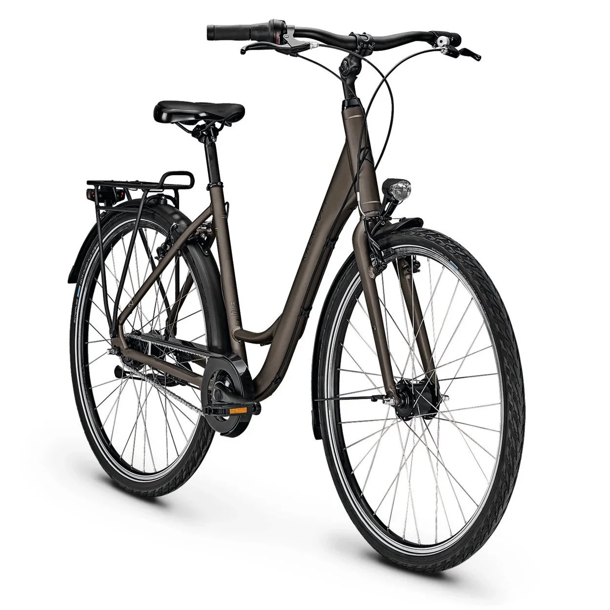 Met de Shimano Nexus 7-speed naafversnellingen heb je een uitgebreide versnellingskeuze die perfect voldoet voor dagelijks gebruik. De Nexus wordt beschouwd als een bijzonder duurzaam en onderhoudsarm tandwielsysteem. Lichtgewicht V-Brakes en de mooi gevormde stijve vork dragen bij aan de gewichtsreductie. Een volledige LED-verlichting met naafdynamo, bagagedrager, spatborden, zijstandaard en een kettingkast ronden het totaalpakket af en zorgen ervoor dat de elegante Kalkhoff indruk maakt op de weg.