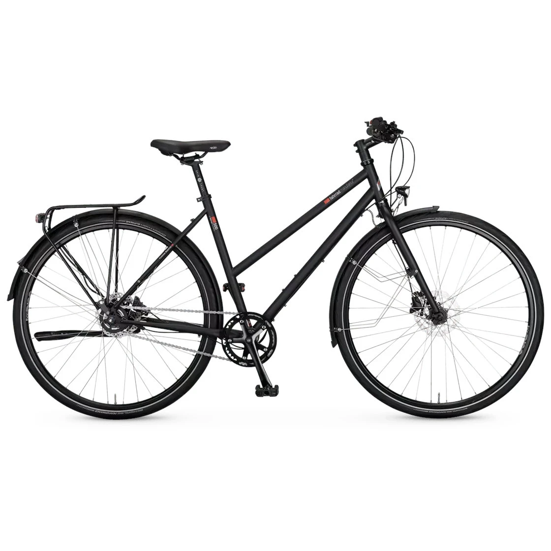 Niet zelden zijn vsf fahrradmanufaktur trekkingfietsen het belangrijkste vervoermiddel en een integraal onderdeel van een op duurzaamheid gebaseerde levensfilosofie. Om te voldoen aan de daaruit voortvloeiende eisen van duurzaamheid en comfort, biedt vsf de T-500, een bijzonder geschikt model voor dagelijks gebruik met 160mm schijfremmen van Shimano. Bij dit model is het robuuste stalen frame gecombineerd met een comfortabele 8-speed Alfine naafversnelling van Shimano en beproefde hoogwaardige componenten: zadel van Selle Royal, Racktime bagagedrager, Busch & Müller verlichtingssysteem, Schwalbe Marathon banden of ergonomische handvatten van Herrmans – ontdek de trekkingfiets voor comfortgeoriënteerde rijders.